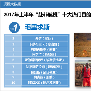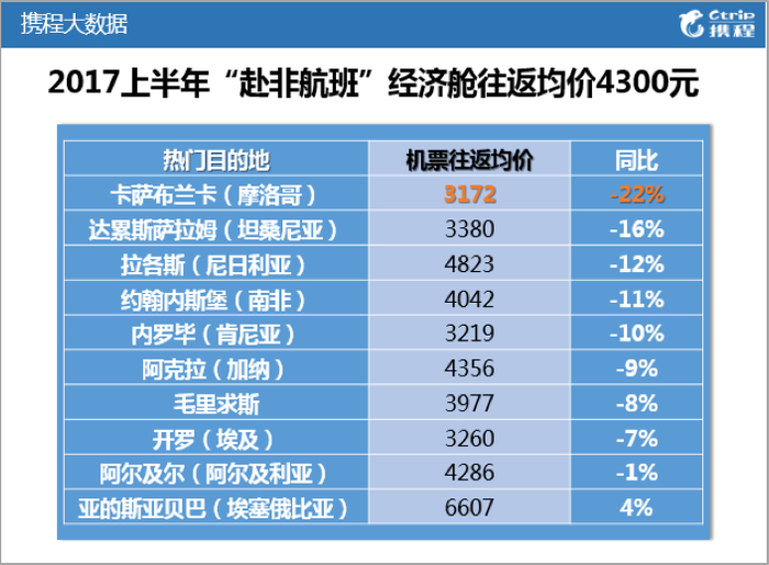 据携程旅行网统计,飞往非洲的航班预订量已经呈现大幅增长趋势。并且,2017年上半年,“赴非航班”往返机票均价约为4300元,同比下降3%,其中,毛里求斯最为热门。