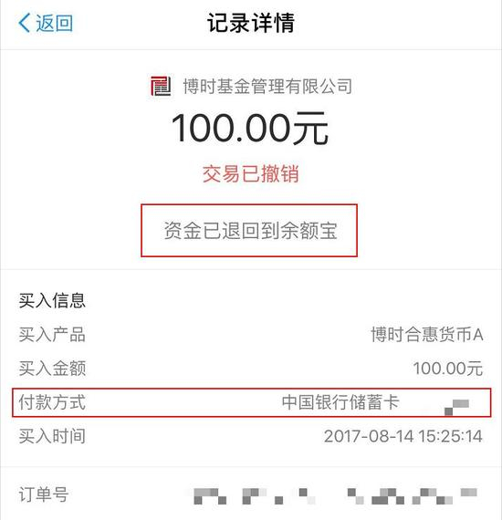 2.如果嫌买入卖出太麻烦,那还有一个更加便捷、快速的方式:购买货币基金等产品后,可以马上撤销交易,这种情况下,钱并不会原路返回银行卡中,而是被退回到余额宝内。这相当于无障碍快速“借道”转钱到余额宝。