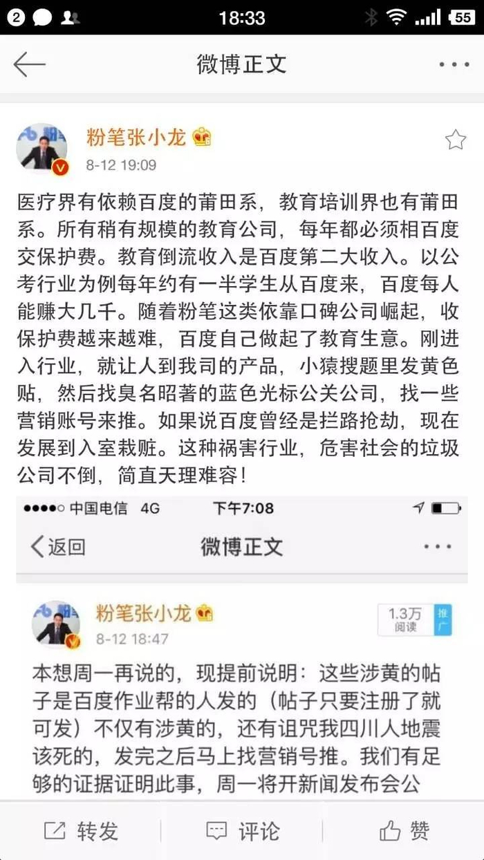 通过法律途径,小猿搜题联系新浪微博官方后,各营销大号删除了虚假内容,同时小猿搜题掌握了操纵微博营销号的公关公司及其背后细节。调查发现,这家公关公司有一个专门团队服务百度作业帮。李鑫没有透露公关公司的名字,称跟这些营销号有过接触的就能知道是哪家公司。而粉笔网CEO张小龙则在微博上表示,这家公关公司叫蓝色光标。