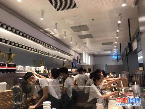 在取茶等待间隙,记者发现在十几平米的水吧操作间内,有大约16名工作人员,分为A、B两个水吧,每个水吧8人,分别负责点餐收款、喊号发茶、配送原料、制作4块业务,其中制作人员最多,两水吧合计10人。同时开工,虽然忙碌但人员各司其职条理清楚倒也不觉得拥挤。