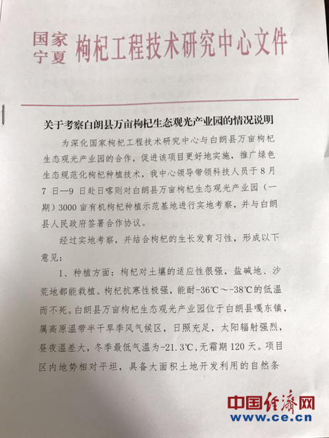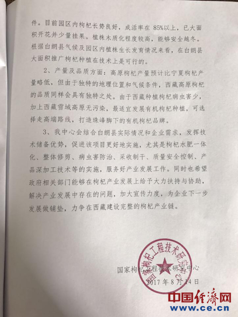 记者在查阅资料发现,就在前几天,8月7日-9日国家枸杞工程技术研发中心刚来过白朗枸杞园考察,给出的结论是:由于独特的地理位置和气候条件,西藏高原枸杞的品质具有独特之处。由于西藏种植枸杞病虫害少,加上西藏雪域高原无污染,最适宜发展枸杞种植,可选择走高端路线。