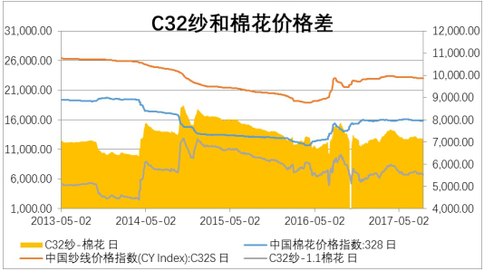 因此,我们按照内地的棉花现货价倒推,CF1711 以后的合约的棉花的价格平均要比内地现货价低 500 元/吨左右,因此,我们在内地 C32 支棉纱-郑棉的价差中,价差区域从6600—8000 上调至 7100-8500 元/吨,中位数 7800 元/吨。而在 9-12 月的采收季,价差区域在 7400-8800 元/吨,中位数 8100 元/吨。