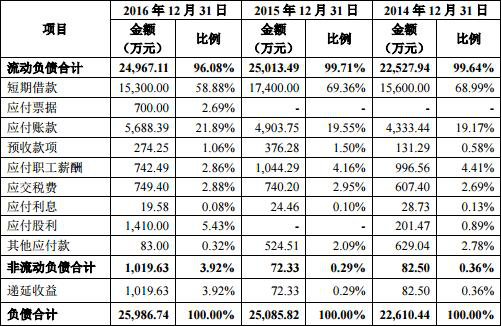 南卫股份2012年至2016年负债总计分别为25,840.97万元、20,477.74万元、22,610.44万元、25,085.82万元、25,986.74万元;其中流动负债分别为25,740.97万元、20,390.75万元、22,527.94万元、25,013.49万元、24,967.11 万元。
