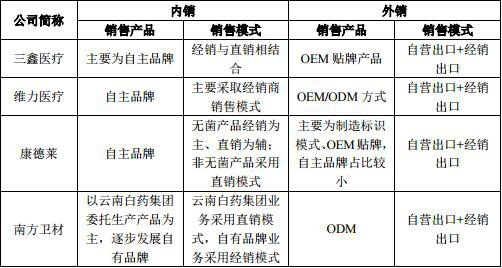 同行业可比上市公司三鑫医疗、康德莱以境内市场销售自主品牌产品为主,产品品牌附加值相对较高,因此综合毛利率水平较高。维力医疗与公司业务模式相似,境外业务主要采取 OEM/ODM 模式,但维力医疗境外业务主要采用直销方式,省去了中间经销商环节的流通成本且享受出口退税优惠,因此综合毛利率水平高于公司。
