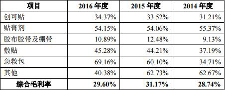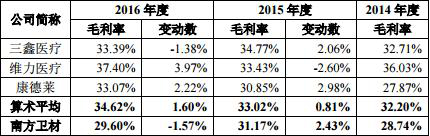 同行业可比公司分别有三鑫医疗、维力医疗、康德莱。三鑫医疗2014年至2016年综合毛利率分别为32.71%、34.77%、33.39%;维力医疗同期综合毛利率分别为36.03%、33.43%、37.40%;康德莱27.87%、30.85%、33.07%。