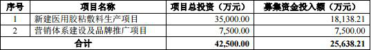 1.新建医用胶粘敷料生产项目,项目总投资35,000.00万元,募集资金投入额18,138.21万元;2.营销体系建设及品牌推广项目,项目总投资7,500.00万元,募集资金投入额7,500.00万元。