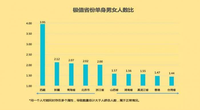 上图可以看到,西藏、新疆和青海三个西部省份囊括男女比最不均衡的前三,其中西藏的单身男女比达到了不可思议的3.95:1,也就是说大概70%的西藏单身汉子可能会遥遥无妻。