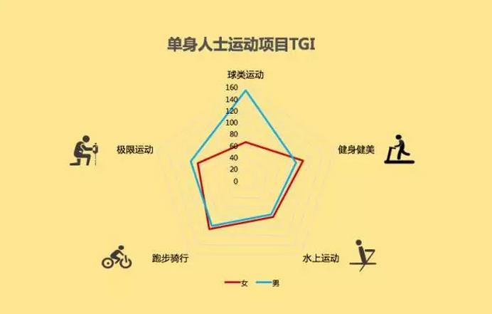 运动项目兴趣,从单身女性的数据只读出了三个字:不、喜、欢。除了在健身健美和跑步骑行达到了平均水平外,其余几个项目都偏低。
