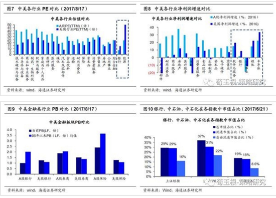 虽然A股整体估值低于美股,但大部分行业估值水平仍高于美股。目前标普500、道琼斯指数的PE(TTM)分别为21倍、18倍,上证综指PE(TTM)为15倍,整体来看A股估值比美股低。但从细分行业的估值来看,A股中大部分行业的估值仍高于美股,尤其是技术硬件与设备(A股41倍、美股17倍)、半导体(A股38倍、美股20倍)、生物制药(A股35倍、美股20倍)、软件服务(A股43倍、美股28倍)等板块。从金融板块的PB(LYR,下同)估值来看,A股中仅银行板块PB低于美股,券商、保险板块的PB估值均高于美股。A股银行、券商、保险当前PB分别为0.9、1.9、2.4倍,美股相应行业PB为1.2、1.5、1.3倍。A股中仅银行(A股7倍、美股14倍)、能源(A股24倍、美股58倍)板块估值低于美股。在前期报告《考虑海外中概股,沪深300失真500点》中我们统计过,截止2017/6,银行、中石油、中石化等大盘股在上证A股总市值占比达29%。因为银行、能源板块在A股中市值占比大,而估值低,拉低了整体市盈率,所以整体看A股估值跟美国接轨,但很多细分行业A股估值仍比美股高。
