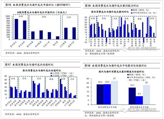 A股消费龙头已经与国际接轨,家电、汽车、服装行业存在龙头股估值折价。我们在前期报告《消费:龙头估值已经国际接轨——A股国际化系列2》中曾经分析过,对比 A股消费龙头与国际龙头估值,大部分A股消费龙头估值已经与国际接轨,略高的估值匹配较高净利润增速。从行业估值溢价角度来看,海外消费龙头大部分有估值溢价,国内部分消费龙头如茅台、索菲亚、恒瑞等也已经出现溢价,但家电中的格力、美的、上汽、森马等仍然是折价。茅台股份、索菲亚、恒瑞医药个股PE分别为31倍、47倍、57倍,行业PE为29倍、40倍、38倍。格力、美的、上汽、森马个股PE分别为14倍、17倍、10倍、15倍,行业PE为21倍、21倍、14倍、24倍。盈利角度,国内消费龙头在16年净利润增速、和ROE水平方面普遍超过海外龙头企业,我们统计国内龙头企业16年平均ROE23.4%,平均净利润增速23.5%,高于海外龙头的19.7%和9.7%.