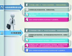 而ICO投资流程则与其有着较大的差异:首先,ICO项目创始人招募人才,形成自己的经营团队,并拥有该经营团队;其次,经营团队进行经济活动,设计制造功能性应用或专有代币,获得经济回报;第三,经营团队发行并拥有其产品与服务——功能性应用或专用代币;第四,外部投资人出资,投资对象为此团队产品和服务,即其发行的功能性应用或代币,以投入资金换取该功能或代币的部分所有权;第五,投资人的收益与该功能性应用或代币的投机价值产生直接联系。