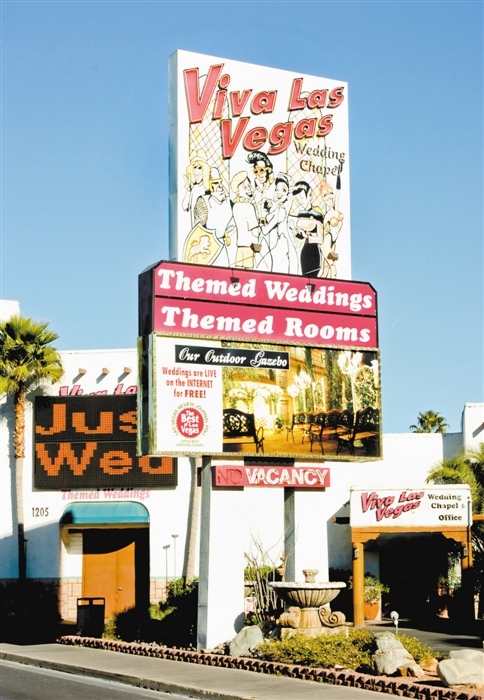 结婚流程快、免体检等规定,让拉斯维加斯顺理成章荣登“结婚天堂”宝座,情侣们一时“婚”了头,只要花60美元向位于拉斯维加斯老城区的克拉克郡民政局办理登记,即可取得结婚许可证,接着把一切交给婚礼公司搞定。当天领证,当天举行婚礼仪式!