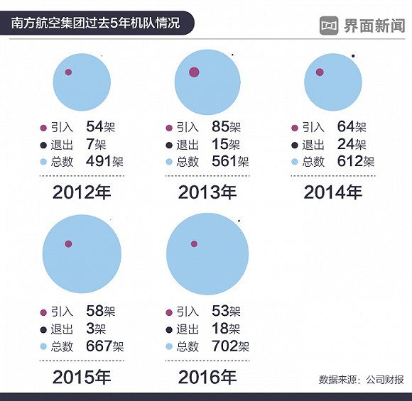 过去5年时间,南航的机队规模从不到500架攀升到超过720架,一跃成为亚洲规模最大的航空公司,同一时期,有67架飞机退出南航的机队。