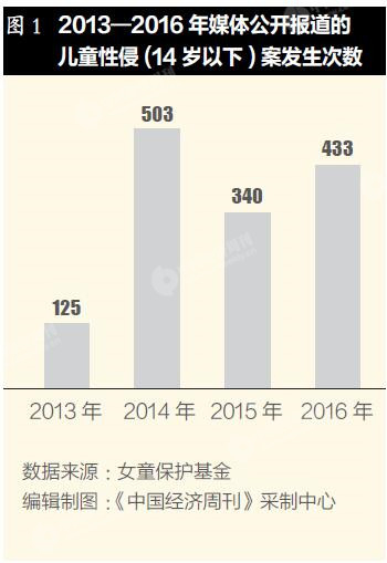 当然不。中国少年儿童文化艺术基金会女童保护基金(以下简称“女童保护”)曾发布数据:2016年全年,仅仅是媒体公开报道的性侵儿童(14岁以下)案例,就有433起,平均每天曝光1.21起。这个数据,近年来居高不下(见图1)。