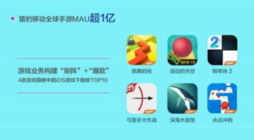 《钢琴块 2》和《滚动的天空》依旧深受用户喜爱。据 App Annie 数据,在过去的一年中,《钢琴块 2》和《滚动的天空》一直排在美国音乐类游戏和桌面类游戏下载排行榜的前三名。猎豹还先后推出了《跳舞的线》、《弓箭手大作战》、《深海水族馆》等多款新游戏,长期稳居iOS 全球手游下载榜TOP10。
