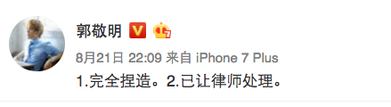 当日晚22:09,郭敬明在微博上表示,该事件完全是捏造,已让律师处理。
