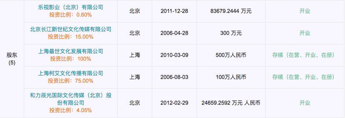 2015年,郭敬明通过协议转让的形式,以每股1元的价格,获得了乐视影业500万股,占比0.6%。同年,与郭敬明合作过多次的和力辰光公司也再次与他进行股权交易,当年年报显示,郭敬明为和力辰光前十大股东,股权占比为4.05%。2016年,和力辰光登上新三板,郭敬明的身家也增加了1.35亿元。