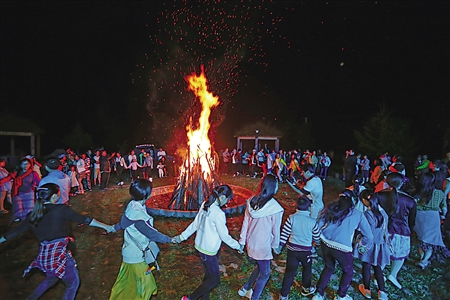 晚8点,随着熊熊火焰迅速蹿上天际,游客们围着篝火,踩着轻快的音乐,手拉手跳起了舞蹈。当地村民也准备了《钱棍舞》、《姐儿十八春》等颇具城口特色的节目,喜迎八方来客。