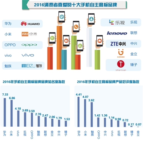 近日,中华商标协会、中国统计信息服务中心联合发布“2016年消费者喜爱的十大手机自主商标品牌”,华为、小米、OPPO位列前三,vivo、魅族、乐视、联想、中兴、金立、锤子也榜上有名。这一结果与市场反馈虽略有出入但总体一致,反映出品牌效应在消费中的“含金量”越来越高。