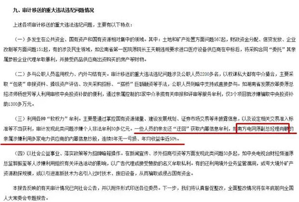 报告称,审计移送的重大违法违纪问题情况显示,一些违法案件以“软权力”牟利,通过掌控国有资源储量、建设发展规划、证券市场交易等未披露信息,及设定相关交易准入标准等不当获利。