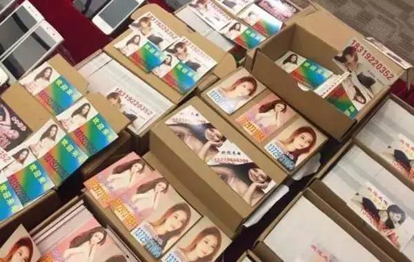劣质的印刷,各类美女的照片,强烈暗示性的话语,以及预约电话号码或微信号……