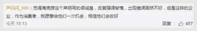 到了下午14:46:海底捞在其新浪微博发出致歉信,回应称:经调查,媒体披露的问题属实,这让我们感到非常难过和痛心,也十分愧疚,我们愿承担相应的经济责任和法律责任,也已布置在海底捞所有门店进行整改。