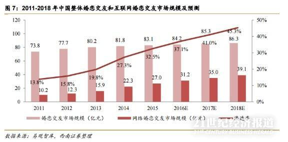 根据易观智库的数据,2015 年中国婚恋市场整体规模为 83.1 亿元,同比增长 1.6%,其中网络婚恋市场规模为27亿元,同比增长 21.1%,渗透率为 32.5%,较 2014年增长 5.2%。网络婚恋市场经过十多年的发展,商业模式较成熟,未来增速趋缓,预计 2018 年网络婚恋市场规模达到39.1亿元,渗透率达到 45.3%。
