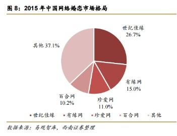 随着网络婚恋市场的快速发展,我国网络婚恋市场已形成四家独大的寡头竞争格局,从2015 年网络婚恋市场收入格局来看,世纪佳缘、有缘网、珍爱网、百合网四家厂商已占据行业近 63%的份额,营收占比分别为 26.7%、15.0%、11.0%和 10.2%。其中世纪佳缘年收入为 7.2 亿元,比第二、三名的收入总和还多,领先优势非常明显。