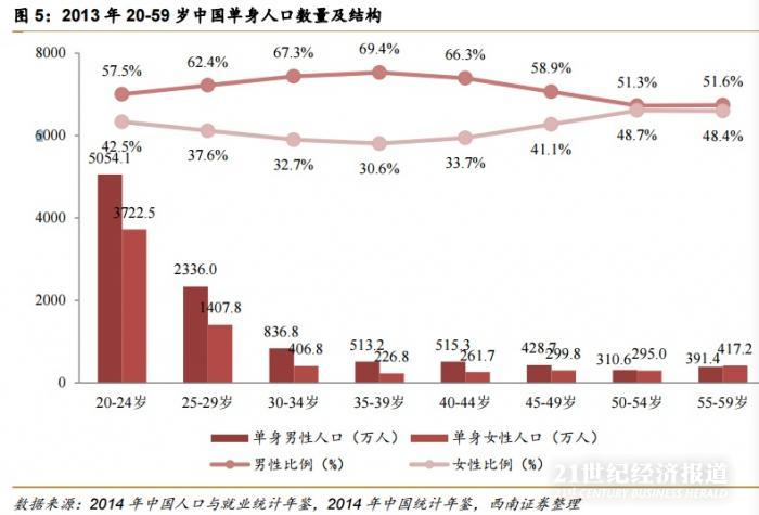 《2014 年中国人口与就业统计年鉴》和《2014 年中国统计年鉴》数据显示,2013 年我国20岁至59岁年龄段单身人口总数为1.7亿人,其中男性为1.04亿人,占比59.6%,女性为0.7亿人,占比 40.4%。男性比女性多近 3500 万人,未来此差异将不会改变。