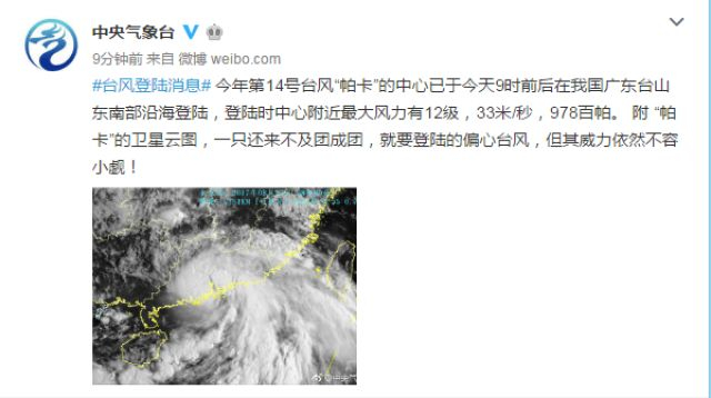 今年第14号台风“帕卡”的中心已于今天9时前后在我国广东台山东南部沿海登陆,登陆时中心附近最大风力有12级,33米/秒,978百帕。 附 “帕卡”的卫星云图,一只还来不及团成团,就要登陆的偏心台风,但其威力依然不容小觑!>>