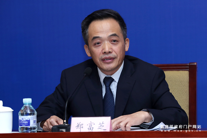 教育部部长助理、党组成员、教材局局长郑富芝介绍义务教育三科教材统编工作有关情况。(张劲松/摄)