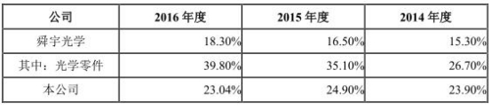 公司主营业务毛利率低于舜宇光学零件业务的毛利率。公司以安防领域的镜头为主,此外包括部分消费类和新兴类镜头。镜头的运用领域不同,市场竞争状况存在差异,因此公司镜头产品的毛利率与舜宇光学的镜头产品存在差异,但是公司作为国内安防领域的优秀镜头供应商,毛利率保持在较高水平。