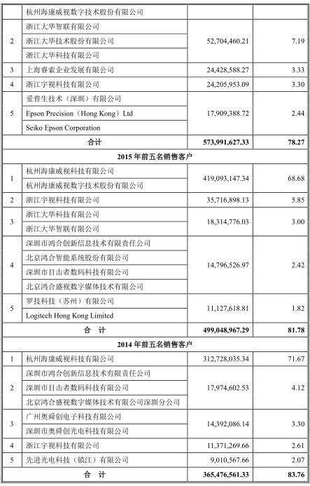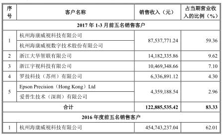 2013-2017年1-3月,公司对前五大客户销售收入合计分别为1.29亿元、3.65亿元、4.99亿元、5.74亿元、1.23亿元,占公司当期营业收入的比例分别为 67.44%、83.76%、81.78%、78.27%和 83.33%,其中对海康威视的销售金额分别为 0.68亿元、3.13亿元、4.19亿元、4.55亿元、0.88亿元,占公司当期营业收入的比例分别为35.80%、71.67%、68.68%、62.01%、59.36%。