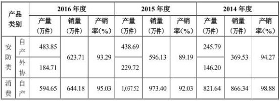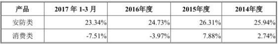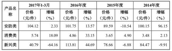 2013-2017年1-3月,公司安防类产品价格分别为51.06元/件、100.15元/件、89.59元/件、101.75元/件、104.12元/件。消费类产品价格分别为3.41元/件、3.48元/件、3.65元/件、4.86元/件、5.74元/件。新兴类产品价格分别为93.77元/件、84.47元/件、78.66元/件、113.81元/件、40.79元/件。