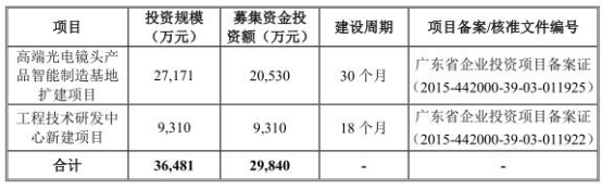 联合光电本次募集资金29,840万元用于高端光电镜头产品智能制造基地扩建项目、工程技术研发中心新建项目。