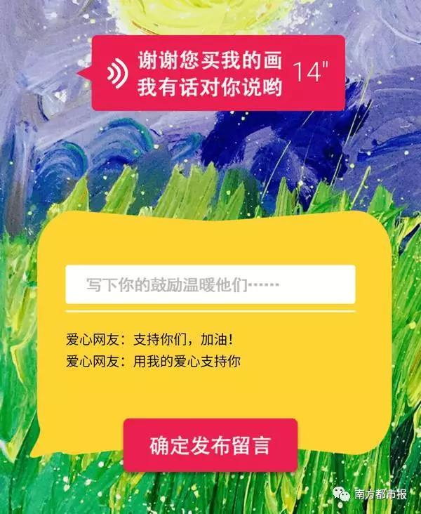 参与者参与“小朋友”画廊活动,只要1元或者输入任意金额,就可以“购买”下他们的画,爱心画作可以保存到手机,当做屏保。