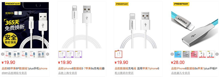 不过,据一位业内人士透露,品胜不能获得认证的原因在于,其已经进入了苹果的“黑名单”。“品胜目前在售的苹果数据线都是不具备MFi认证的,这样损害了苹果的利益,因此,苹果是不会给品胜认证的。此外,品胜卖‘山寨’数据线的利润很高,成本只有3元左右,售价却普遍在18元以上。”