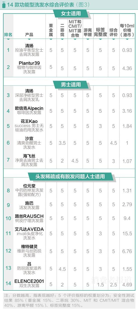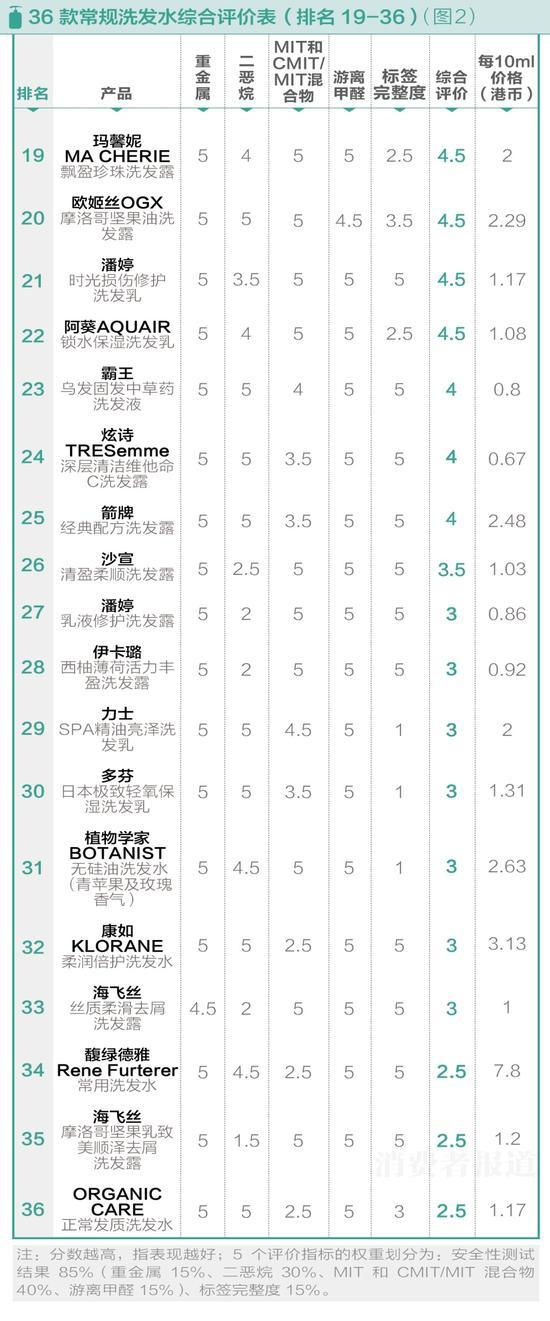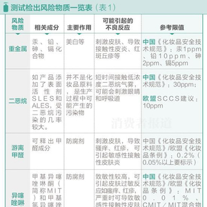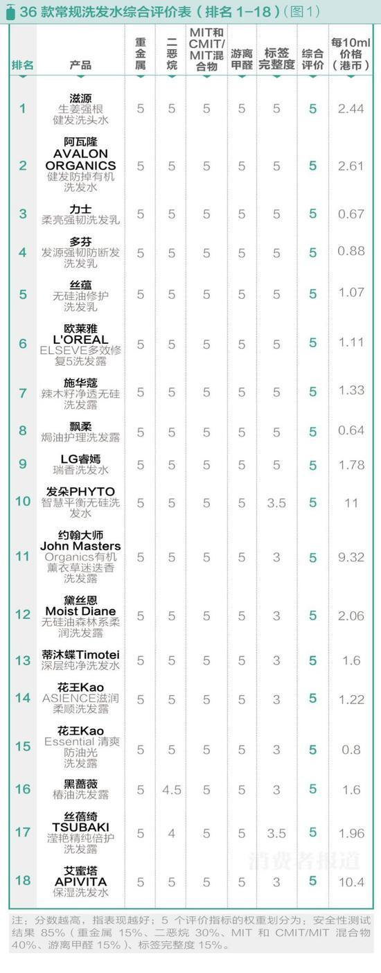 2017年8月,香港《选择》测试了50款热门洗发水,检测安全性项目包括:重金属、二恶烷、MIT 及CMIT/MIT混合物、游离甲醛等指标。(如表1)