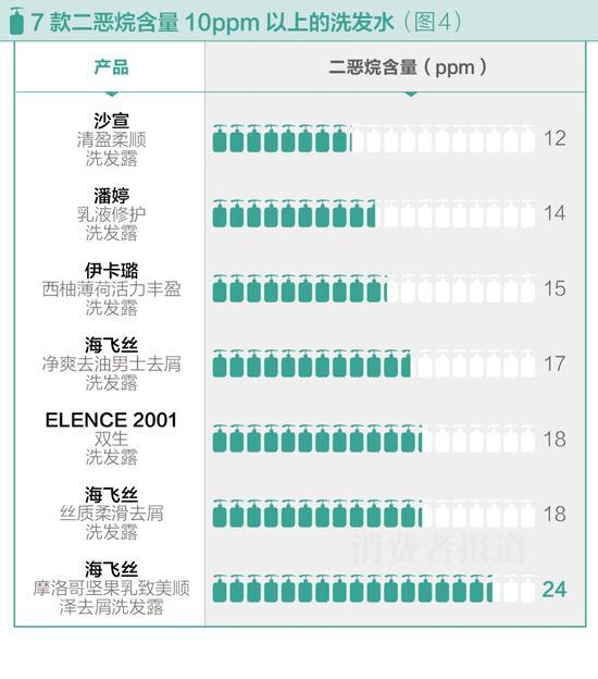 其中,海飞丝摩洛哥坚果乳致美顺泽去屑洗发露的二恶烷检出含量最高,为24ppm。(如图4)