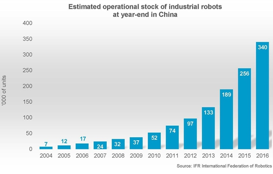 中国2004-2016年应用中的工业机器人数量(来源:IFR报告)