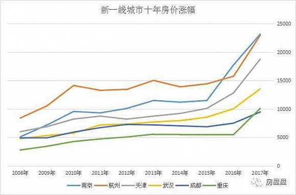 从涨幅上看,南京十年涨幅高达353%,重庆为266%,天津为211%,而杭州、武汉、成都均不到200%。