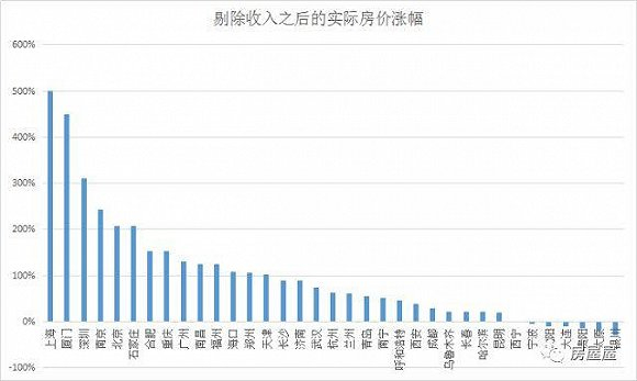 通过简单剔除收入涨幅,可以得到各城市十年房价实际涨幅: