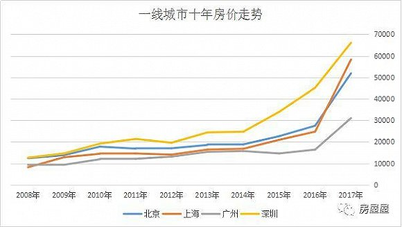 2008年时,广州房价与北上深还在同一条起跑线,1万元左右,而到了十年后,当北上深房价全部突破5万时,广州房价却还在3万左右徘徊。