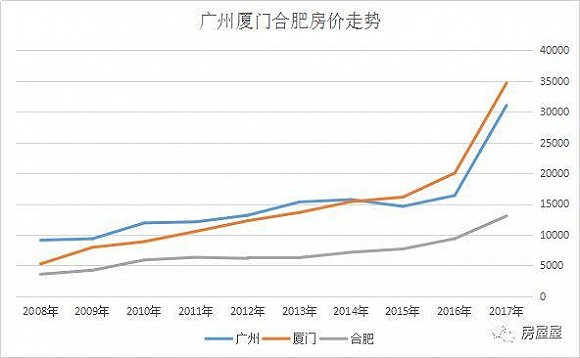 2008年,厦门房价只有5000多元,而到了2017年,一跃达到3.4万元。无论是房价绝对值,还是涨幅,都超过了作为一线城市的广州。