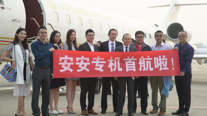 2017年9月4日,经过2个多小时舒适安全的飞行,安安专机的首架共享公务机从北京起飞降落在了武汉,实现首航成功。据透露,此次值飞的机型为庞巴迪挑战者飞机,承运人为江苏公务航空,安安专机真正实现了“共享飞机”从理念到现实的挑战成功,国内公务机共享出行实现首飞。本次活动刚推出,搭机名额在20分钟内便被一抢而空,公务机共享出行的市场潜力巨大。据悉,著名企业家潘石屹先生成为此次共享飞机出行的“第一人”。