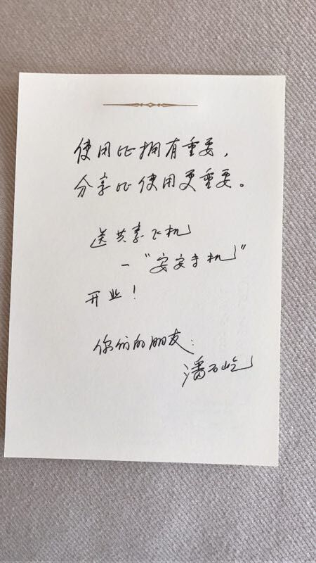作为国内共享飞机出行“第一人”——著名企业家潘石屹先生一直喜欢挑战新鲜事物。他对共享经济及安安专机非常赞赏,他对媒体表示,“如今共享经济涉及的领域很多,对社会有意义,可以有效利用各种资源、提升效率。共享单车、共享汽车、共享住房,共享飞机的价值量很大,值得去做。我们SOHO也正在全国推进共享办公的创新。”他对安安专机寄语称:“使用比拥有重要、分享比使用重要”。据悉,潘石屹先生不仅成为共享飞机出行“第一人”,也成为了安安百人会会员“第一人”。
