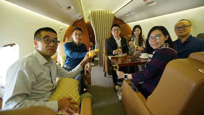 陈军说,今后想乘坐公务机和私人飞机,不必花大价钱包机,依靠互联网共享平台,能像拼“顺风车”一样拼机,不仅比传统公务机出行便宜便捷,甚至价格会超乎想象。“我们这次首航,正值一位乘客的生日,一起出行的乘客们给他在万米高空开了个红酒、蛋糕‘生日趴’,这样的个性化服务也许只有公务机能实现。搭乘共享公务机不仅价格更便宜、乘机体验也会更好。”