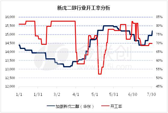 判断一个产品是不是产能过剩,行业整体开工率就能反映问题。从图可以看出,新戊二醇工厂上半年有两次开工的高峰期,当开工率达到高峰时,新戊二醇价格将会持续走弱,但当开工率下降后市场价则快速回升。将开工率数据转换成产量得出数据,1-6月国内新戊二醇产量为10.7万吨,全国总产能为27.4万吨,半年产能为13.7万吨,行业开工率为78%,其中多数歧化装置并不能达产,修正后开工率竟达到85%,属于非常高数值。所以我们无需再质疑新戊二醇价格。