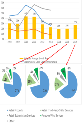 图表4:亚马逊的收入增长率和收入占比,2008 - 2016年