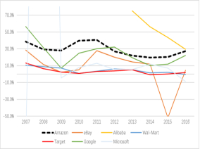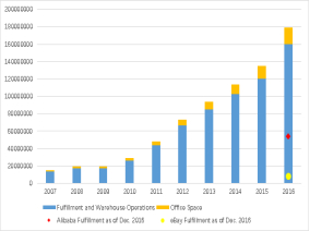 1亚马逊的基本竞争优势在于其适应性,其在线零售优势和日益重要的实体业务为在线百货市场提供了肥沃的土壤。与主要的实体零售商沃尔玛相比,亚马逊的在线销售仅占其总收入的2.8%,但亚马逊对客户更了解。拥有机器学习技术,58个可用性区域基础设施,以及通过每月26.5亿的流量收集而来的客户数据,亚马逊可以使用算法确定实体店和配送中心的最优位置。此外,在网上零售方面,eBay的战略计划受其中介业务的影响,没有足够的基础设施投资来满足在线新鲜食品市场日益增长的需求。最后,中国分散的交通网络和城乡结构,以及消费者对当地食品的偏好,限制了阿里巴巴在中国开拓在线百货市场。与同行相比,亚马逊在电子商务方面占据了有利地位。随着仓库和物流中心在全国各地布局,公司可以利用这些基础设施来迅速推出新产品。
